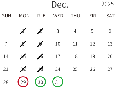 - =12/30(10:00-16:00),12/31(10:00-15:00)