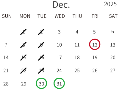 - =12/30(10:00-16:00),12/31(10:00-15:00)