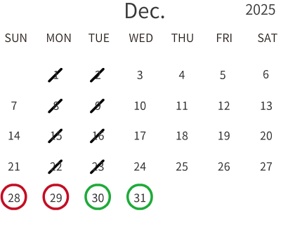 - =12/30(10:00-16:00),12/31(10:00-15:00)
